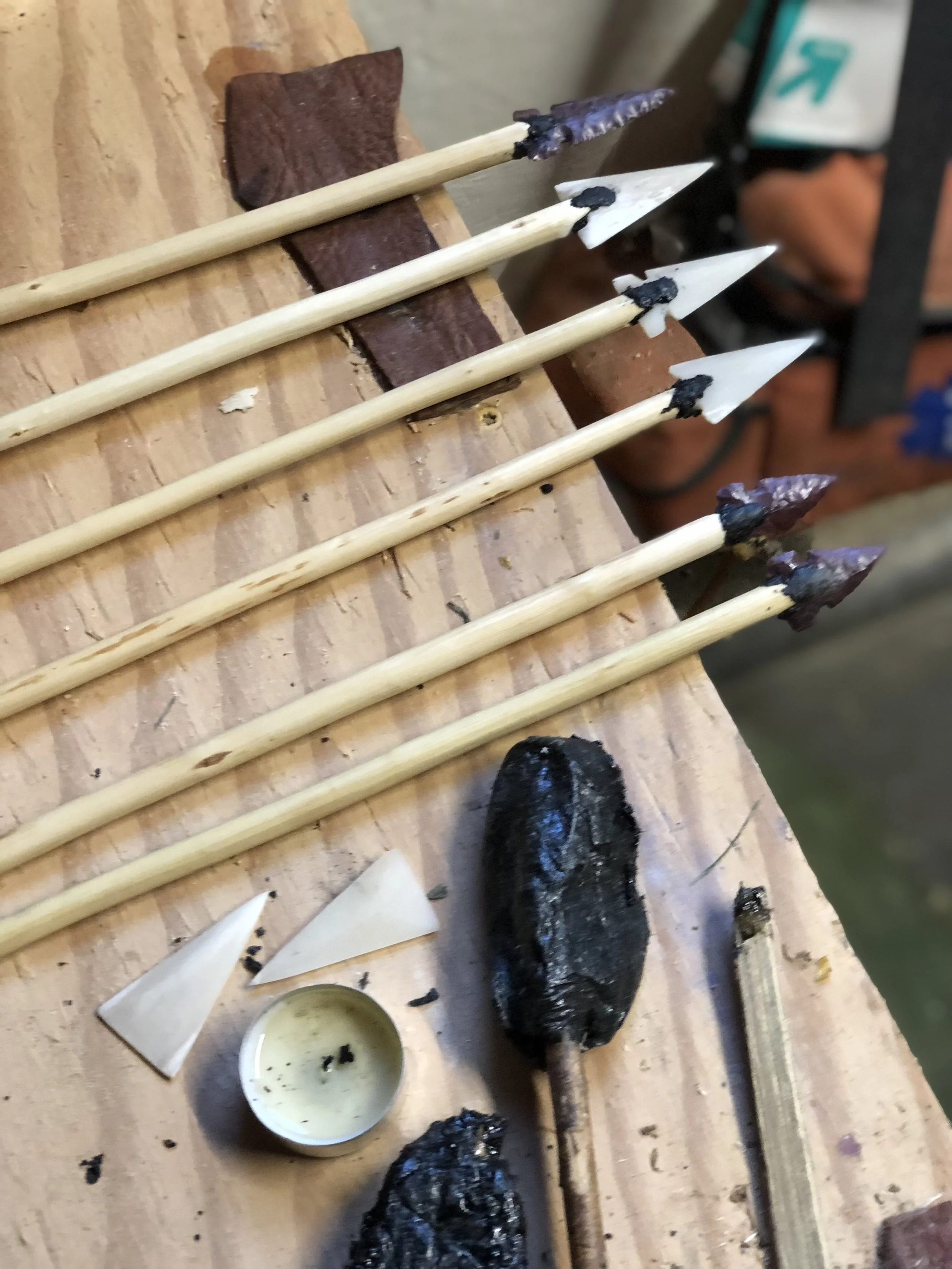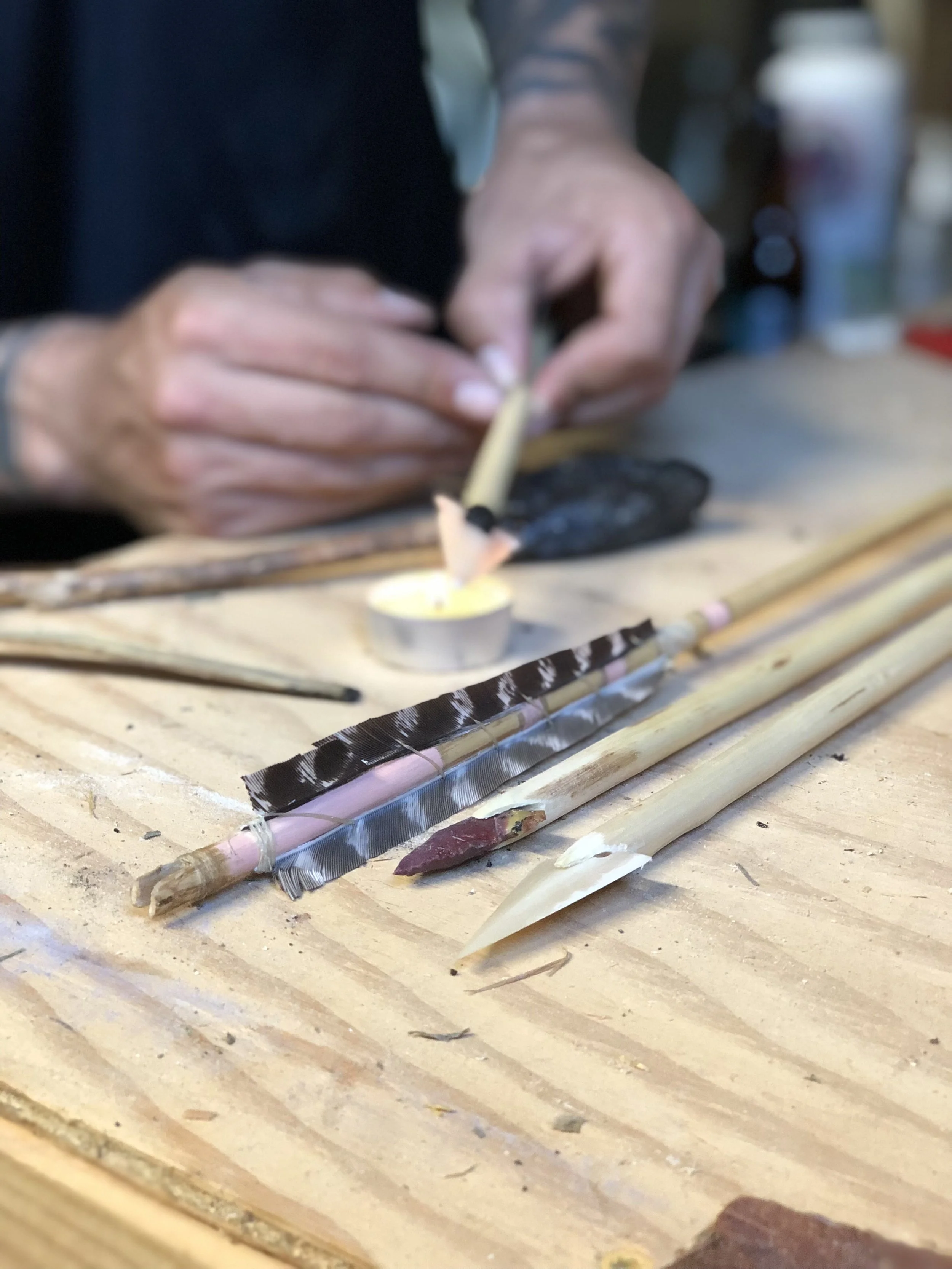 To complete the arrow making process we have to dive deep into the ancient methods of flint knapping. Creating arrow heads from stone, volcanic glass and bones from elk or deer . This is an extremely extensive process and needs 2 full days to really dive deep into the process so students understand what it takes to not only make arrow heads but how we can teach someone else about what steps are involved. Once arrow heads are made, we follow up with the arrows we began earlier by hafting the arrowhead to the shaft with the sinew we already processed in previous lessons.